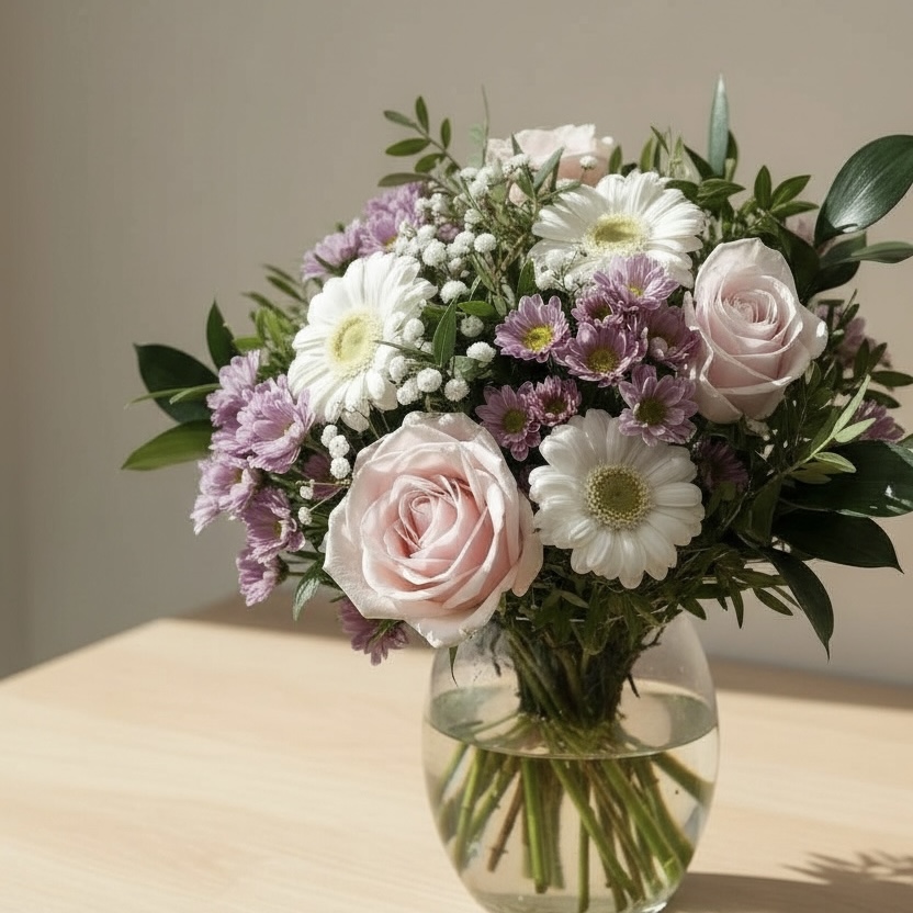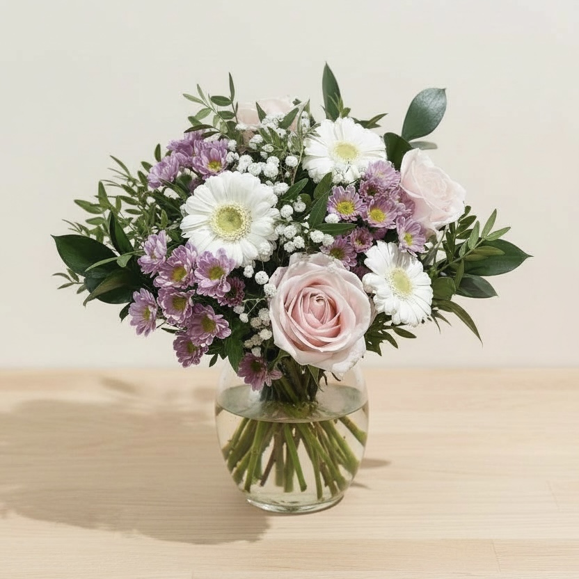 Ce bouquet de germinis roses associe des fleurs délicates aux tons lumineux et un feuillage vert frais. Sa composition légère et moderne transmet joie, douceur et optimisme.