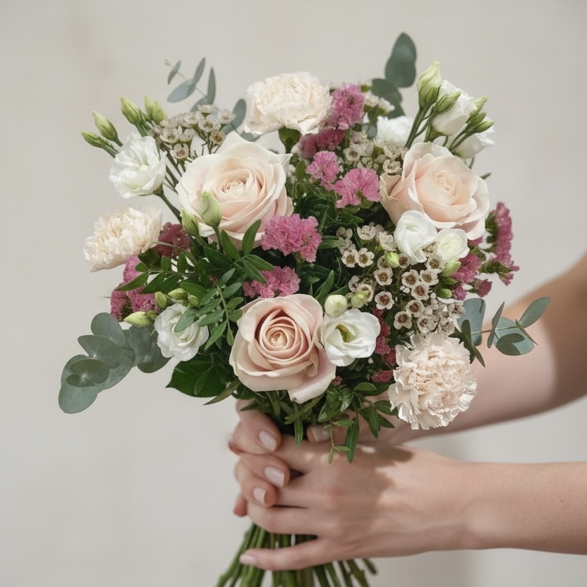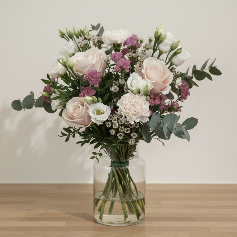 Ce bouquet romantique aux tons roses poudrés associe roses délicates, petites fleurs blanches et feuillage léger. Il évoque la douceur, la féminité et l’élégance naturelle.