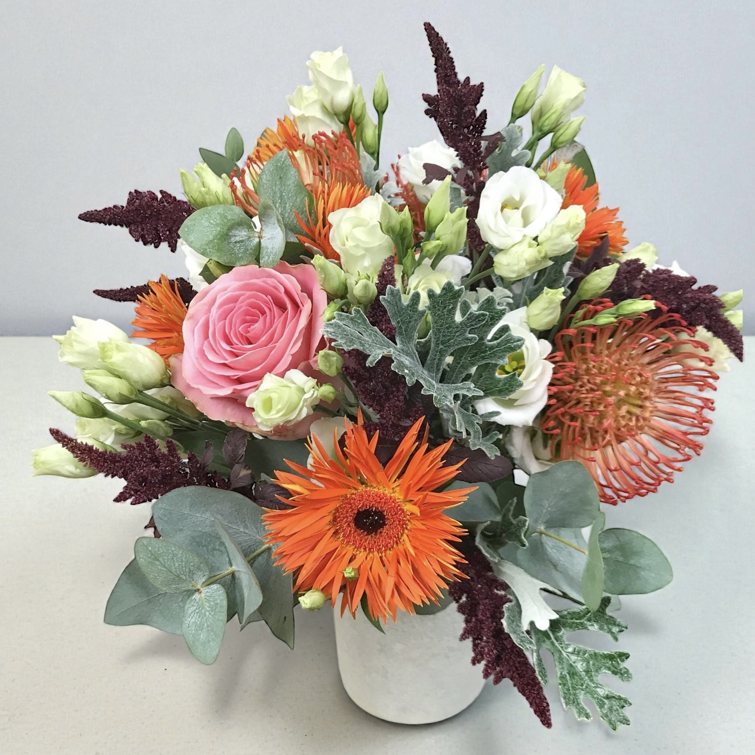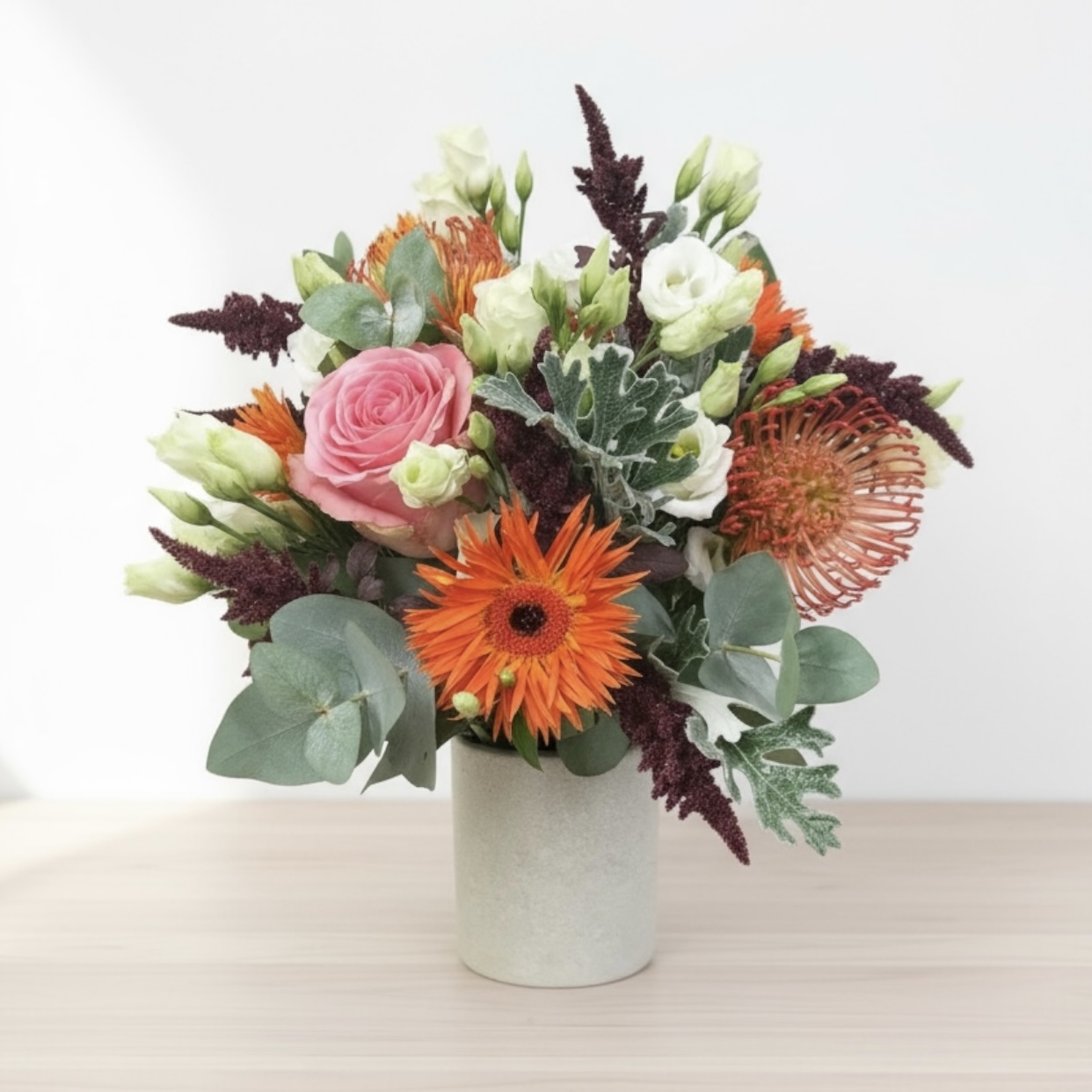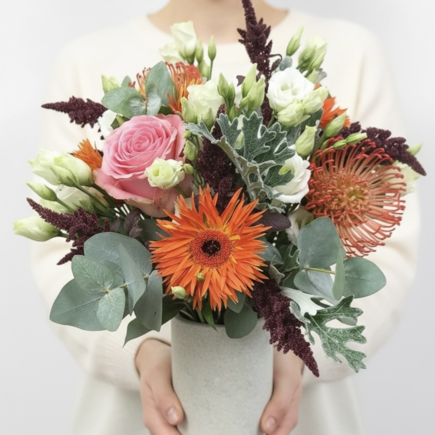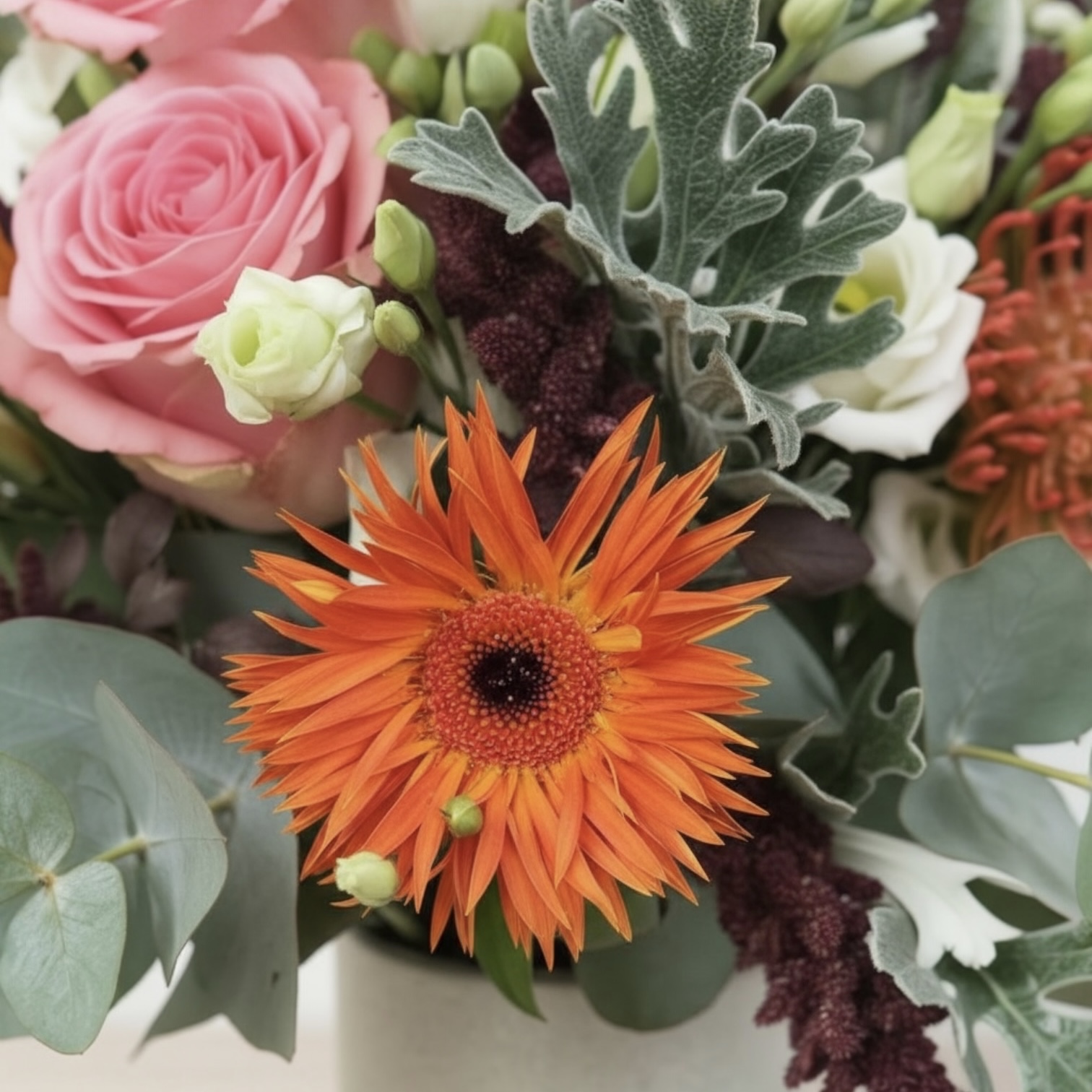 Le bouquet Butterfly associe gerbera orange, roses délicates, fleurs blanches et feuillage texturé. Son style naturel et créatif en fait une composition moderne et tendance.