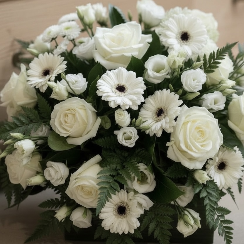 Ce coussin funéraire blanc est une composition florale sobre et élégante, réalisée avec des fleurs blanches fraîches et un feuillage discret. Symbole de paix, de pureté et de respect, il convient parfaitement pour accompagner un hommage solennel.